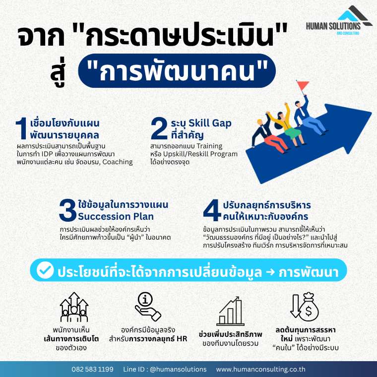 การประเมินผลพนักงานไม่ควรจบลงแค่ “การกรอกแบบฟอร์ม” หรือ “ตัวเลขบนกระดาษ” แต่ควรถูกต่อยอดไปสู่ การพัฒนาคน อย่างจริงจัง! หากองค์กรสามารถ ใช้ข้อมูลจากการประเมินให้เกิดผลจริง จะทำให้พนักงานมีการเติบโต องค์กรมีความแข็งแกร่ง และพร้อมแข่งขันในระยะยาว